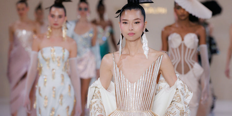 precision of haute couture, with corset lace-ups, feathered shawls, and pleated silk all coming together in an